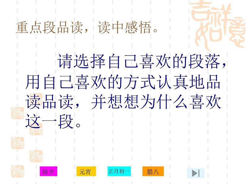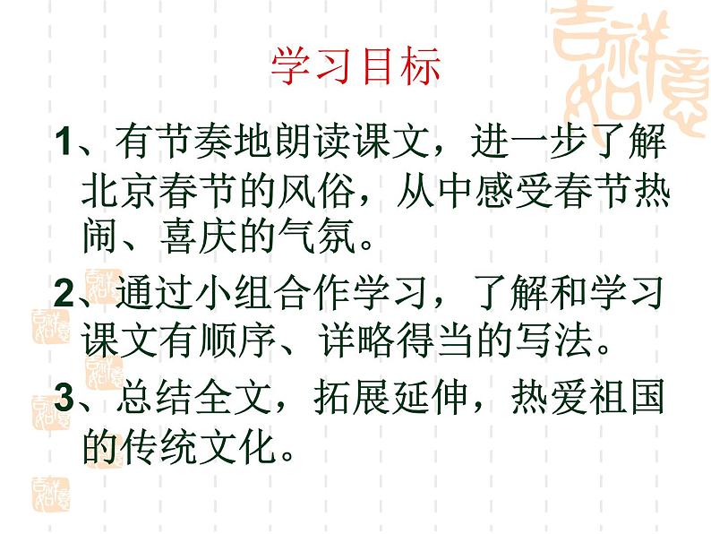 1、有节奏地朗读课文,进一步了解北京春节的风俗,从中感受春节热闹、喜庆的气氛。 2、通过小组合作学习,了解和学习课文有顺序、详略得当的写法。 3、总结全文,拓展延伸,热爱祖国的传统文化。