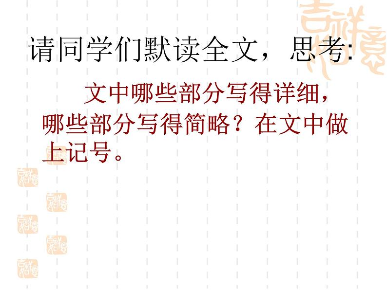 请同学们默读全文,思考: 文中哪些部分写得详细,哪些部分写得简略?在文中做上记号。