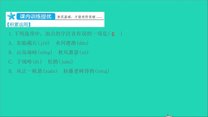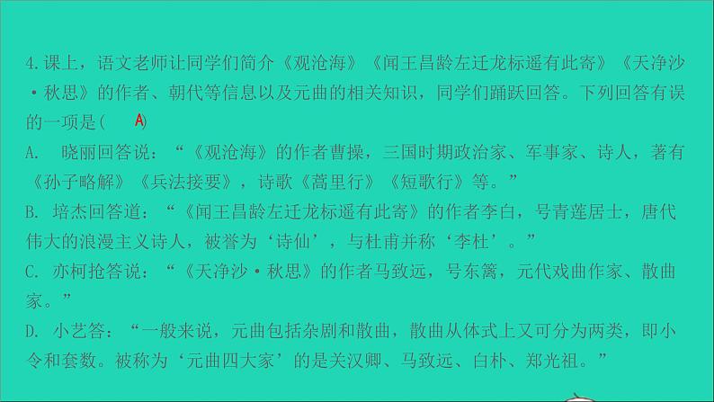 第一单元4 古代诗歌四首1.下列选项中,加点的字注音有误的一项是( )A. 东临碣石(jié) 水何澹澹(dàn)B. 山岛竦峙(sǒng) 秋风萧瑟(sè)C. 子规啼(dì) 杜鹃(juān)D. 风正一帆悬(xuán) 枯藤老树昏鸦(téng). . . . . . . . C2.解释下列句中加点的词。耸立 达到极点 指王昌龄 旅人前行的路3.下列对诗句的朗读节奏划分有误的一项是( )A. 秋风/萧瑟,洪波/涌起。B. 海日/生残夜,江春/入旧年。C. 夕阳/西下,断肠/人在天涯。D. 我寄/愁心/与明月,随君/直到/夜郎西。C4.课上,语文老师让同学们简介《观沧海》《闻王昌龄左迁龙标遥有此寄》《天净沙·秋思》的作者、朝代等信息以及元曲的相关知识,同学们踊跃回答。下列回答有误的一项是( )A. 晓丽回答说:“《观沧海》的作者曹操,三国时期政治家、军事家、诗人,著有《孙子略解》《兵法接要》,诗歌《蒿里行》《短歌行》等。”B. 培杰回答道:“《闻王昌龄左迁龙标遥有此寄》的作者李白,号青莲居士,唐代伟大的浪漫主义诗人,被誉为‘诗仙’,与杜甫并称‘李杜’。”C. 亦柯抢答说:“《天净沙·秋思》的作者马致远,号东篱,元代戏曲作家、散曲家。”D. 小艺答:“一般来说,元曲包括杂剧和散曲,散曲从体式上又可分为两类,即小令和套数。被称为‘元曲四大家’的是关汉卿、马致远、白朴、郑光祖。”A5.名句默写。(1)水何澹澹, 。(2) ?归雁洛阳边。(3) ,小桥流水人家。(4)杨花落尽子规啼, 。(5)行舟江上,吴均在富春江感受了“急湍甚箭,猛浪若奔”的汹涌气势,而王湾在北固山下领略了“ , ”的浩渺景象。山岛竦峙 乡书何处达枯藤老树昏鸦 闻道龙标过五溪潮平两岸阔 风正一帆悬(一)观 沧 海 曹 操东临碣石,以观沧海。水何澹澹,山岛竦峙。树木丛生,百草丰茂。秋风萧瑟,洪波涌起。日月之行,若出其中;星汉灿烂,若出其里。幸甚至哉,歌以咏志。.6.这首诗以“ ”字总领,全诗借景抒情,表达了诗人 。观 一统天下的雄心壮志★7.请你展开合理的想象,用生动形象的语言把“秋风萧瑟,洪波涌起”所表现的画面描述出来。 [示例]秋风阵阵,树林呼呼作响,诗人站在辽阔的大海边,面对波涛汹涌的大海,心潮与大海一起涌动,感慨万千。(二)闻王昌龄左迁龙标遥有此寄李 白杨花落尽子规啼,闻道龙标过五溪。我寄愁心与明月,随君直到夜郎西。8.这首诗的字里行间流露着作者对友人真挚的情意。诗人起笔便用“① ”和“子规啼”写出暮春之景,也写出飘零之感、离别之恨,融情入景;然后又将“② ”当作可以传达情意的使者,以寄托自己对友人的③ 之情。杨花落尽(或“杨花落”) 明月(或“月”)牵挂(或“思念”)9.“月”是古诗中常见的意象。下列诗句中与“我寄愁心与明月”表达的情感类似的一项是( )A. 月出惊山鸟,时鸣春涧中。B. 明月松间照,清泉石上流。C. 湖光秋月两相和,潭面无风镜未磨。D. 可怜楼上月徘徊,应照离人妆镜台。D阅读下面两首元曲,完成10~11题。天净沙·秋思[元]马致远 枯藤老树昏鸦,小桥流水人家,古道西风瘦马。夕阳西下,断肠人在天涯。天净沙·春[元]白朴 春山暖日和风,阑干楼阁帘栊①,杨柳秋千院中。啼莺舞燕,小桥流水飞红②。 [注]①帘栊(lóng):带帘子的窗户。②飞红:花瓣飞舞,指落花。10.对以上两首元曲,下列说法有误的一项是( )A. 曲牌是曲子的调名,又叫曲调。“天净沙”就是曲牌名,“秋思”和“春”则分别是两首小令的题目。B. 《天净沙·秋思》中出现了多个景物,其中“夕阳”为全诗笼罩上一层温暖的色彩,让游子凄凉的心得到安慰。C. 《天净沙·秋思》中的景象相互映衬:动态的“流水”与静态的“小桥”相映,动态的“西风”与静态的“古道”相映。D. 《天净沙·春》的首句为我们描绘了一幅阳光明媚的春色图:“山”春意盎然,“日”暖意融融,“风”和煦温情。B11.两首元曲中都有“小桥流水”,请你结合作品,说说“小桥流水”的图景分别蕴含了诗人怎样不同的情感。马致远在《天净沙·秋思》中,借“小桥流水人家”的美好画面,衬托了漂泊在外的游子内心的孤独凄凉(或:表达了游子对家乡亲人的思念)。白朴在《天净沙·春》中,则通过“小桥流水飞红”之景,抒发了对春天的喜爱之情。12.(2020·杭州)温习课内所学,完成古诗赏析任务。[甲]闻王昌龄左迁龙标遥有此寄[唐]李白杨花落尽子规啼,闻道龙标过五溪。我寄愁心与明月,随君直到夜郎西。[乙]于郡城送明卿之江西[明]李攀龙青枫飒飒雨凄凄,秋色遥看入楚迷。谁向孤舟怜逐客,白云相送大江西。【知背景】甲诗略。乙诗:吴国伦,字明卿,因违忤奸相严嵩,被贬至江西(古属楚地);当时诗人正在郡城济南养病,吴国伦赴江西途经济南时,诗人写下这首诗为其送行。【析场景】甲诗首句以暮春时节漂泊无依的“杨花”和啼声哀切的“子规”,营造了悲惋的氛围,流露出诗人叹飘零、感离恨的特定心情。(1)乙诗前两句:点明了送别的时节和地点,以飒飒青枫和凄凄秋雨营造了一种迷蒙凄凉的氛围,映衬出离别时的不舍之情,也暗含了诗人对朋友前途命运的担忧。【赏写法】甲诗后两句,想象奇特,诗人将自己的“愁心”寄托于“明月”这一意象。以明月随君到夜郎,表达对朋友的牵挂;借“明月”光明的形象表示对朋友的理解和支持。(2)乙诗后两句:想象奇特,诗人将自己对朋友的情感寄托于“白云”,“白云相送”既表达了对朋友的同情和宽慰,又借“白