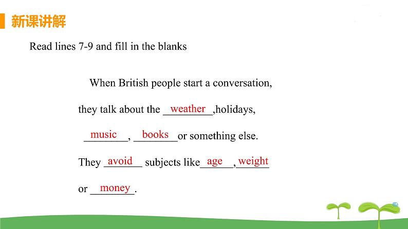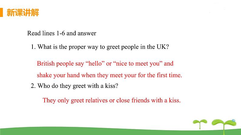 1 教师呈现四个不同的场景:打招呼、交谈、公共场所、家中。让学生说出英国人在这些场景中的礼仪习惯,以帮助学生复习前一课所学内容。