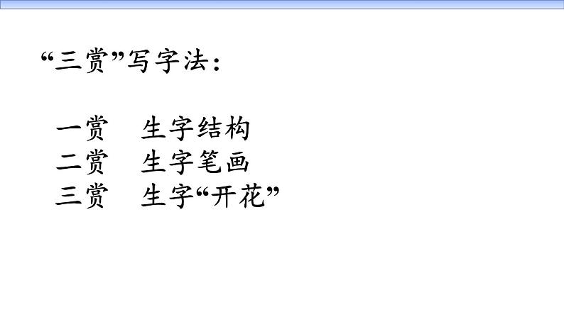 “三赏”写字法: 一赏 生字结构 二赏 生字笔画 三赏 生字“开花”