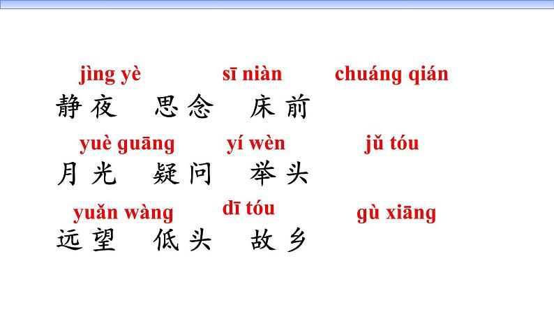 静 夜 思 念 床 前 月 光 疑 问 举 头 远 望 低 头 故 乡