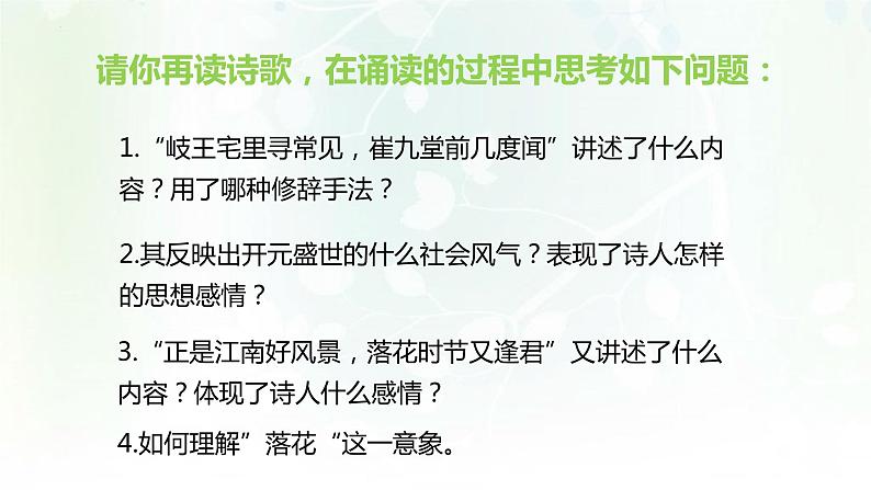 4.明确了诗歌的内容和感情后,相信你对这首诗会有更深刻的理解和体会。下面请你带着感情去诵读本诗,在诵读的过程中思考我们应该如何理解”落花“这一意象。