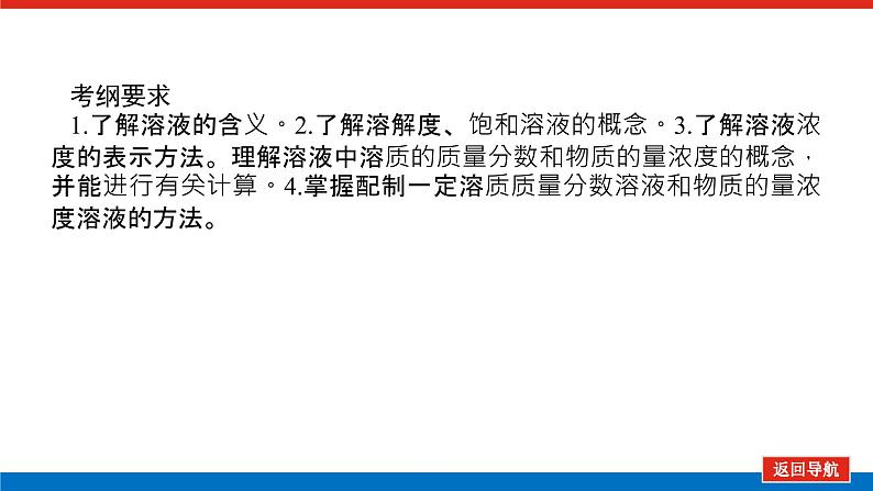 考纲要求1.了解溶液的含义。2.了解溶解度、饱和溶液的概念。3.了解溶液浓度的表示方法。理解溶液中溶质的质量分数和物质的量浓度的概念,并能进行有关计算。4.掌握配制一定溶质质量分数溶液和物质的量浓度溶液的方法。
