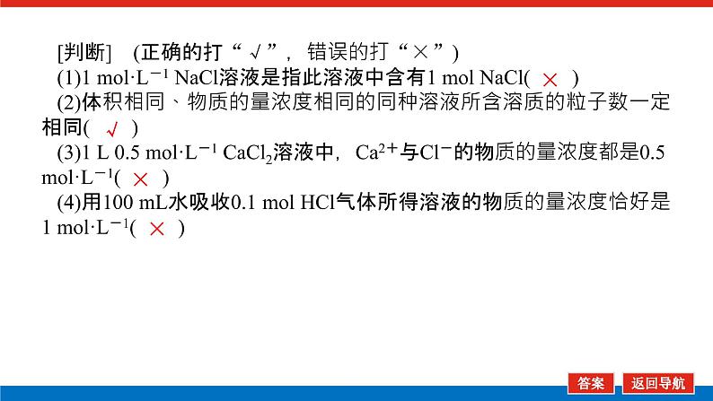 [判断] (正确的打“√”,错误的打“×”)(1)1 ml·L-1 NaCl溶液是指此溶液中含有1 ml NaCl( )(2)体积相同、物质的量浓度相同的同种溶液所含溶质的粒子数一定相同( )(3)1 L 0.5 ml·L-1 CaCl2溶液中,Ca2+与Cl-的物质的量浓度都是0.5 ml·L-1( )(4)用100 mL水吸收0.1 ml HCl气体所得溶液的物质的量浓度恰好是1 ml·L-1( )