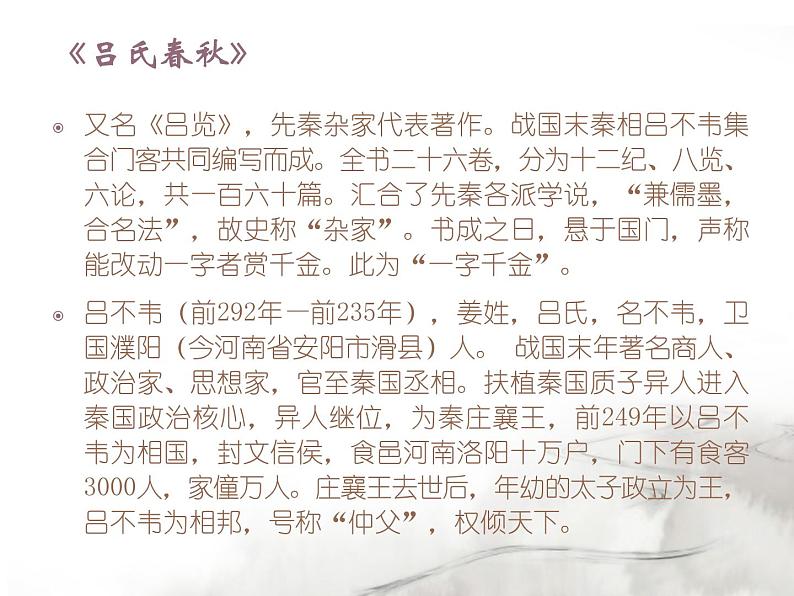 又名《吕览》,先秦杂家代表著作。战国末秦相吕不韦集合门客共同编写而成。全书二十六卷,分为十二纪、八览、六论,共一百六十篇。汇合了先秦各派学说,“兼儒墨,合名法”,故史称“杂家”。书成之日,悬于国门,声称能改动一字者赏千金。此为“一字千金”。吕不韦(前292年—前235年),姜姓,吕氏,名不韦,卫国濮阳(今河南省安阳市滑县)人。 战国末年著名商人、政治家、思想家,官至秦国丞相。扶植秦国质子异人进入秦国政治核心,异人继位,为秦庄襄王,前249年以吕不韦为相国,封文信侯,食邑河南洛阳十万户,门下有食客3000人,家僮万人。庄襄王去世后,年幼的太子政立为王,吕不韦为相邦,号称“仲父”,权倾天下。
