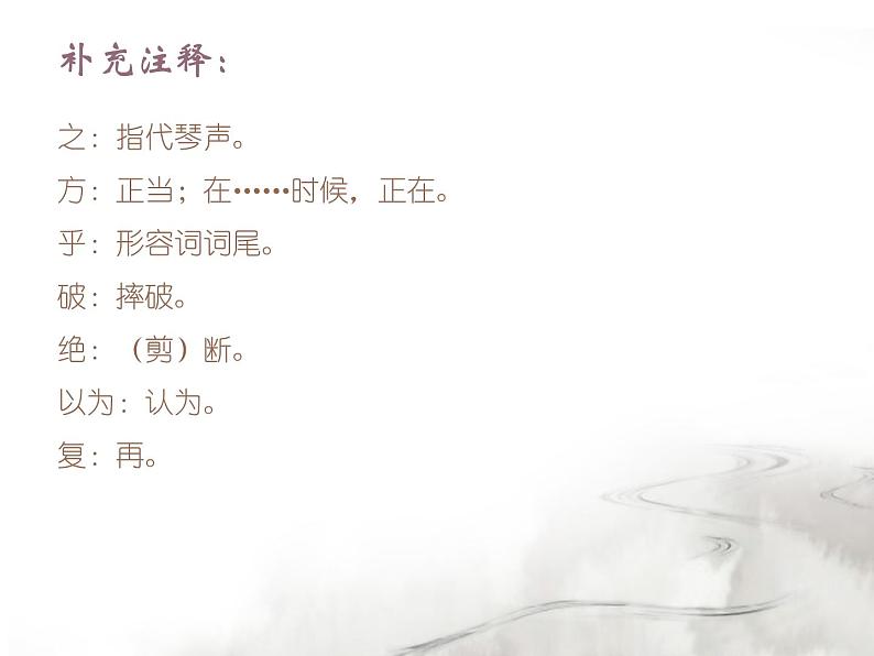 之:指代琴声。方:正当;在……时候,正在。乎:形容词词尾。破:摔破。绝:(剪)断。以为:认为。复:再。