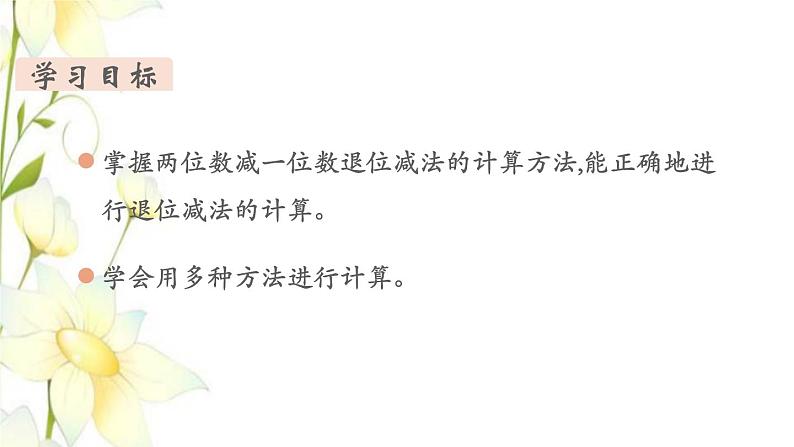 掌握两位数减一位数退位减法的计算方法,能正确地进行退位减法的计算。学会用多种方法进行计算。