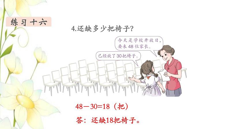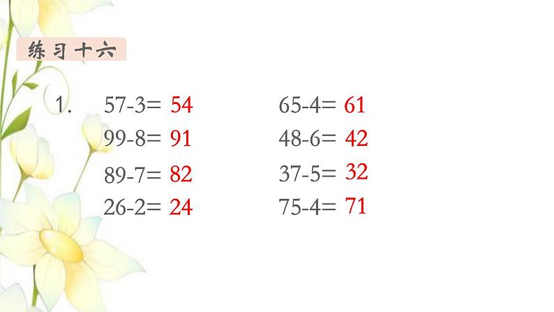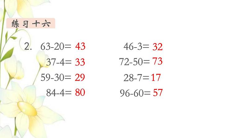 这是一份2020-2021学年两位数减一位数、整十数教学ppt课件,共11页。PPT课件主要包含了学习目标,练习十六,基础练习,拓展练习等内容,欢迎下载使用。