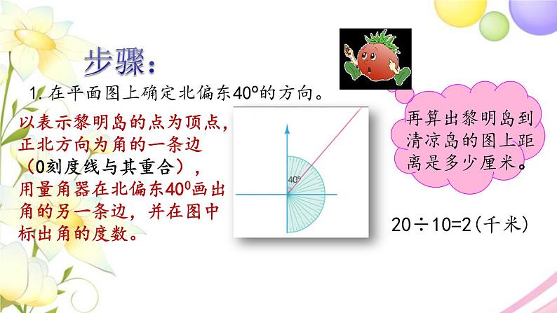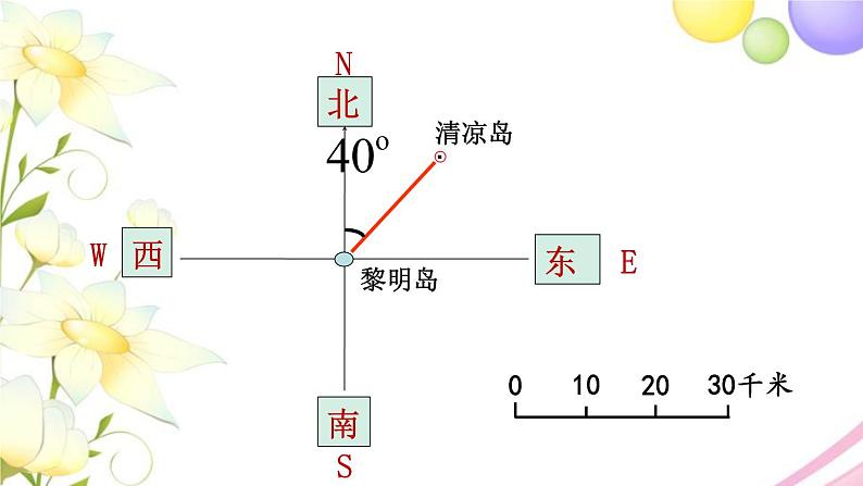 2.某海域有一群岛屿,在黎明岛北偏东40°方向20千米处是清凉岛。你能在图中表示出清凉岛的位置吗?