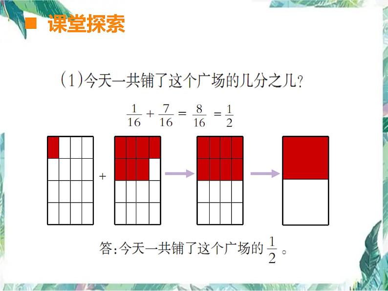 这是一份北师大版五年级下册 分数加减法课件,共11页。PPT课件主要包含了课堂引入,课堂探索,课堂练习等内容,欢迎下载使用。