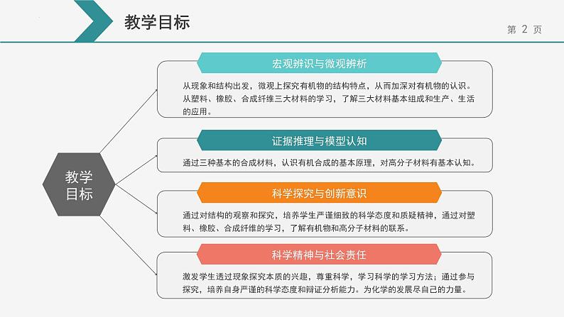 通过对结构的观察和探究,培养学生严谨细致的科学态度和质疑精神,通过对塑料、橡胶、合成纤维的学习,了解有机物和高分子材料的联系。