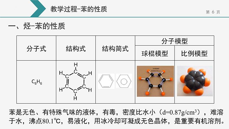 苯是无色、有特殊气味的液体,有毒,密度比水小(d=0.87g/cm3),难溶于水,沸点80.1℃,易液化,用冰冷却可凝成无色晶体,是重要有机溶剂。