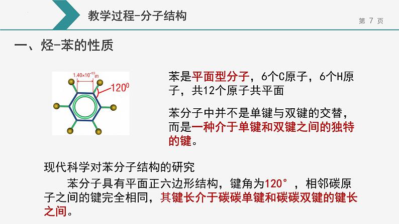 现代科学对苯分子结构的研究 苯分子具有平面正六边形结构,键角为120°,相邻碳原子之间的键完全相同,其键长介于碳碳单键和碳碳双键的键长之间。
