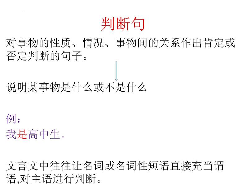 对事物的性质、情况、事物间的关系作出肯定或否定判断的句子。说明某事物是什么或不是什么例:我是高中生。文言文中往往让名词或名词性短语直接充当谓语,对主语进行判断。