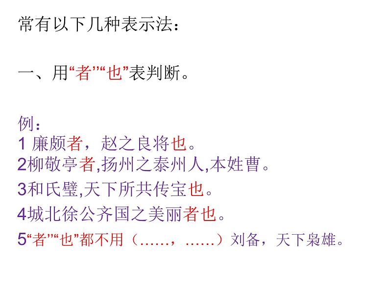常有以下几种表示法:一、用“者’’“也”表判断。例: