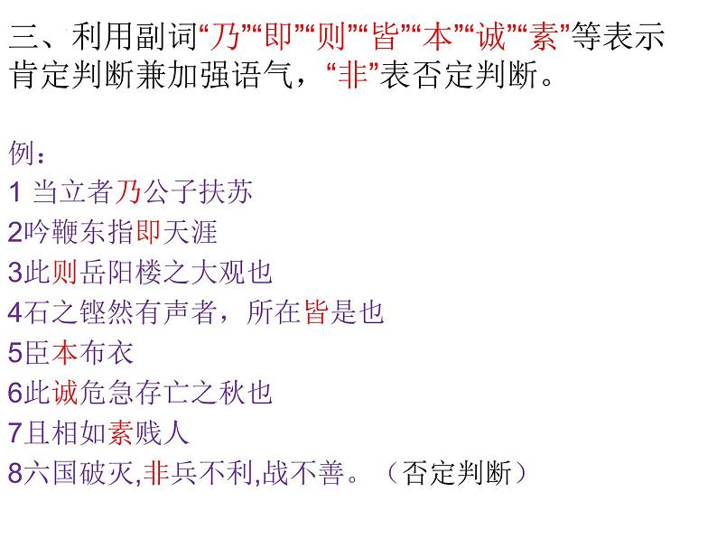 三、利用副词“乃”“即”“则”“皆”“本”“诚”“素”等表示肯定判断兼加强语气,“非”表否定判断。例:1 当立者乃公子扶苏2吟鞭东指即天涯3此则岳阳楼之大观也4石之铿然有声者,所在皆是也5臣本布衣6此诚危急存亡之秋也7且相如素贱人8六国破灭,非兵不利,战不善。(否定判断)