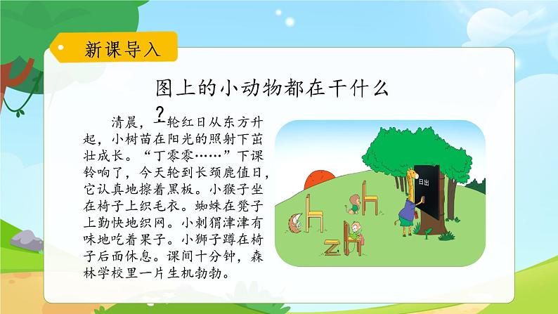 清晨,一轮红日从东方升起,小树苗在阳光的照射下茁壮成长。“丁零零……”下课铃响了,今天轮到长颈鹿值日,它认真地擦着黑板。小猴子坐在椅子上织毛衣。蜘蛛在凳子上勤快地织网。小刺猬津津有味地吃着果子。小狮子蹲在椅子后面休息。课间十分钟,森林学校里一片生机勃勃。