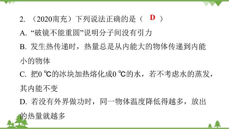 2. (2020南充)下列说法正确的是( )A. “破镜不能重圆”说明分子间没有引力B. 发生热传递时,热量总是从内能大的物体传递到内能小的物体C. 把0 ℃的冰块加热熔化成0 ℃的水,若不考虑水的蒸发,其内能不变D. 若没有外界做功时,同一物体温度降低得越多,放出的热量就越多