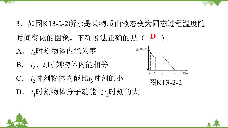 3.如图K13-2-2所示是某物质由液态变为固态过程温度随时间变化的图象,下列说法正确的是( )A. t4时刻物体内能为零B. t2、t3时刻物体内能相等C. t2时刻物体内能比t3时刻的小D. t1时刻物体分子动能比t2时刻的大