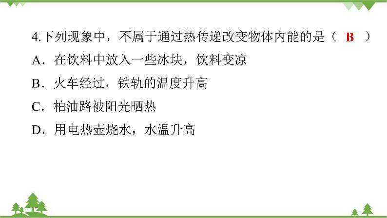 4.下列现象中,不属于通过热传递改变物体内能的是( )A.在饮料中放入一些冰块,饮料变凉B.火车经过,铁轨的温度升高C.柏油路被阳光晒热D.用电热壶烧水,水温升高