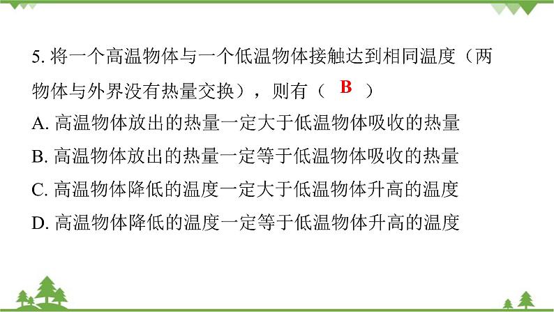 5. 将一个高温物体与一个低温物体接触达到相同温度(两物体与外界没有热量交换),则有( )A. 高温物体放出的热量一定大于低温物体吸收的热量B. 高温物体放出的热量一定等于低温物体吸收的热量C. 高温物体降低的温度一定大于低温物体升高的温度D. 高温物体降低的温度一定等于低温物体升高的温度