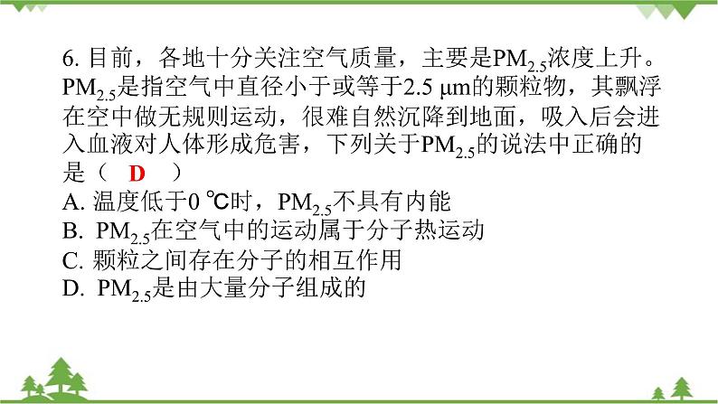 6. 目前,各地十分关注空气质量,主要是PM2.5浓度上升。PM2.5是指空气中直径小于或等于2.5 μm的颗粒物,其飘浮在空中做无规则运动,很难自然沉降到地面,吸入后会进入血液对人体形成危害,下列关于PM2.5的说法中正确的是()温度低于0 ℃时,PM2.5不具有内能B. PM2.5在空气中的运动属于分子热运动颗粒之间存在分子的相互作用D. PM2.5是由大量分子组成的