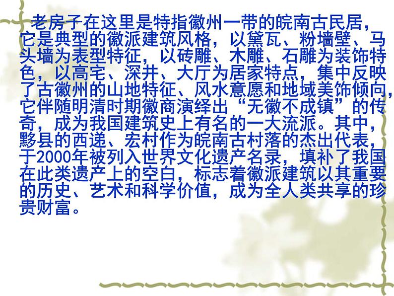 老房子在这里是特指徽州一带的皖南古民居,它是典型的徽派建筑风格,以黛瓦、粉墙壁、马头墙为表型特征,以砖雕、木雕、石雕为装饰特色,以高宅、深井、大厅为居家特点,集中反映了古徽州的山地特征、风水意愿和地域美饰倾向,它伴随明清时期徽商演绎出“无徽不成镇”的传奇,成为我国建筑史上有名的一大流派。其中,黟县的西递、宏村作为皖南古村落的杰出代表,于2000年被列入世界文化遗产名录,填补了我国在此类遗产上的空白,标志着徽派建筑以其重要的历史、艺术和科学价值,成为全人类共享的珍贵财富。