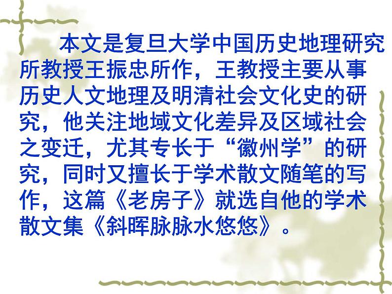 本文是复旦大学中国历史地理研究所教授王振忠所作,王教授主要从事历史人文地理及明清社会文化史的研究,他关注地域文化差异及区域社会之变迁,尤其专长于“徽州学”的研究,同时又擅长于学术散文随笔的写作,这篇《老房子》就选自他的学术散文集《斜晖脉脉水悠悠》。