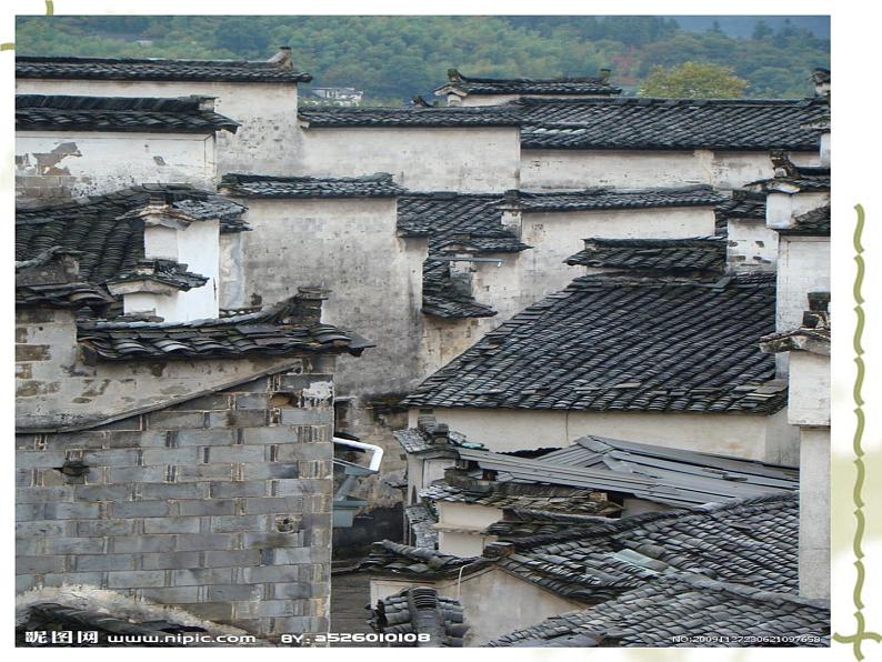 3、这些“建筑形态”的形成分别与哪些“明清徽州特定的自然和社会环境”有关?明确: ⑴、粉墙黛瓦:主要是为了防止雨水侵蚀;但“非能费财而饰”却与事实有着相当大的距离;服贾四方的徽商,或成巨商荣归故里---雨水多;富有⑵、马头墙:由于地狭人稠且聚族而居-地狭人稠且聚族而居⑶、四水归堂:还有对暗室生财的迷信,前者显然与大批徽州男子外出经商有关,后者则源于古老的风水观念-多外出经商;暗室生财的风水观念 ⑷、多楼上架楼:地狭人稠的乡土背景-地狭人稠;易潮易洪(5)、包括木雕在内的三雕:囊托满盈但明清对民间营建制度有严格规定-经济富有但民间营建制度严格