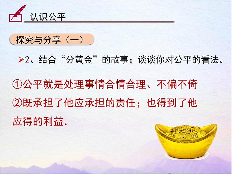 2、结合“分黄金”的故事;谈谈你对公平的看法。