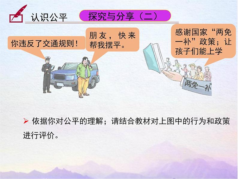 上页左图违背了公平原则,因为每个人都应该遵守交通规则,违反交通规则,受处罚是公平的。 右图中的国家“两免一补”政策,为每个适龄儿童和少年提供同等的发展机会和条件。体现了权利公平和机会公平,权利公平要求每个人依法平等参与社会活动,机会公平要求社会为每个人提供同等的发展机会和条件。