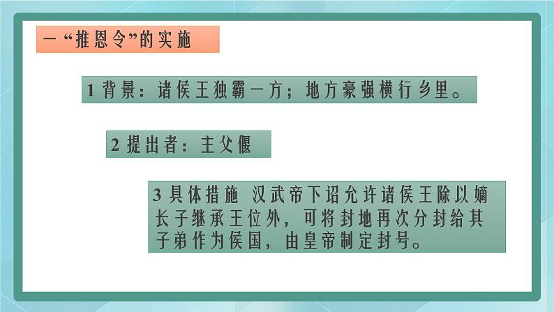 3 具体措施 汉武帝下诏允许诸侯王除以嫡长子继承王位外,可将封地再次分封给其子弟作为侯国,由皇帝制定封号。