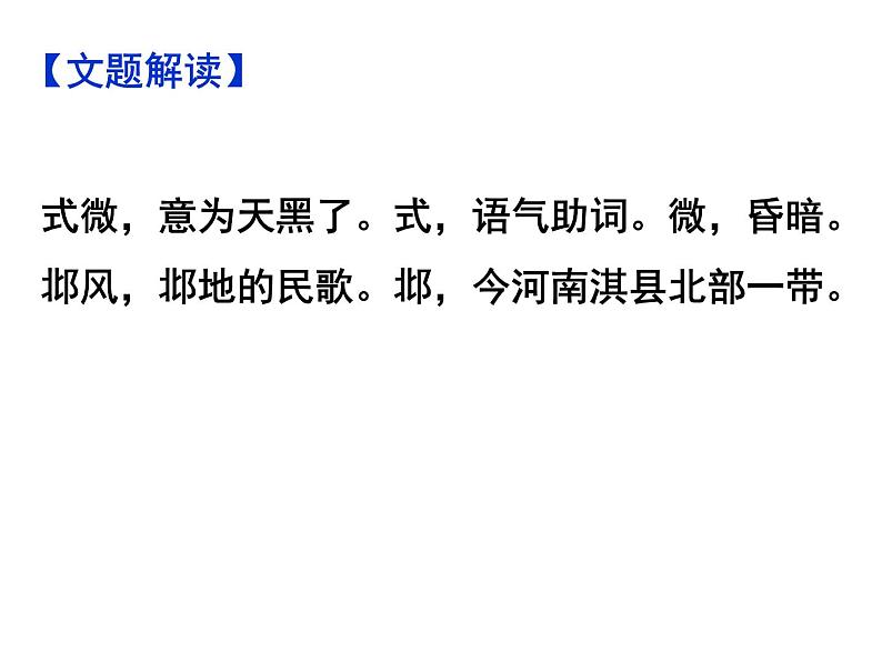 式微,意为天黑了。式,语气助词。微,昏暗。邶风,邶地的民歌。邶,今河南淇县北部一带。