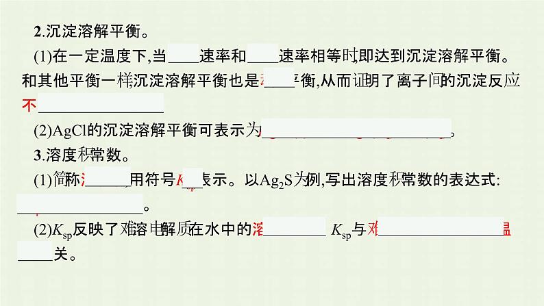 2.沉淀溶解平衡。(1)在一定温度下,当溶解速率和沉淀速率相等时,即达到沉淀溶解平衡。和其他平衡一样,沉淀溶解平衡也是动态平衡,从而证明了离子间的沉淀反应不能完全进行到底。(2)AgCl的沉淀溶解平衡可表示为AgCl(s) Ag+(aq)+Cl-(aq)。3.溶度积常数。(1)简称溶度积,用符号Ksp表示。以Ag2S为例,写出溶度积常数的表达式: Ksp=c2(Ag+)·c(S2-) 。(2)Ksp反映了难溶电解质在水中的溶解能力。Ksp与难溶电解质的性质和温度有关。