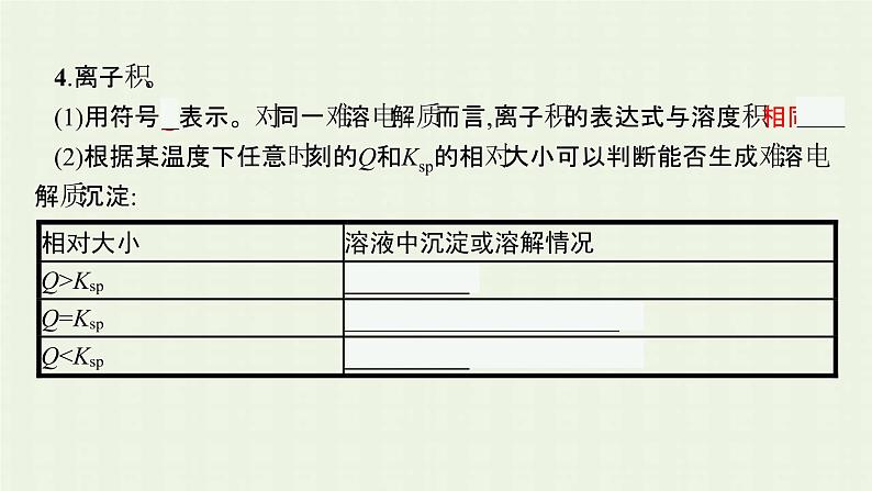 4.离子积。(1)用符号Q表示。对同一难溶电解质而言,离子积的表达式与溶度积相同。(2)根据某温度下任意时刻的Q和Ksp的相对大小可以判断能否生成难溶电解质沉淀: