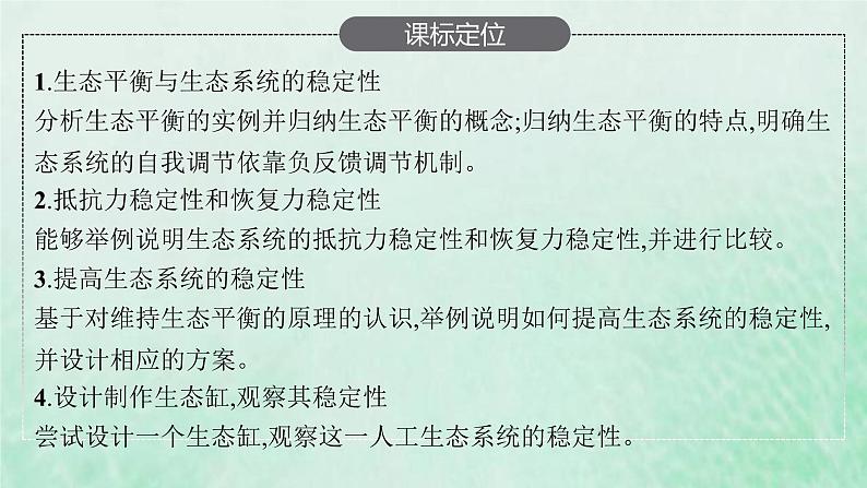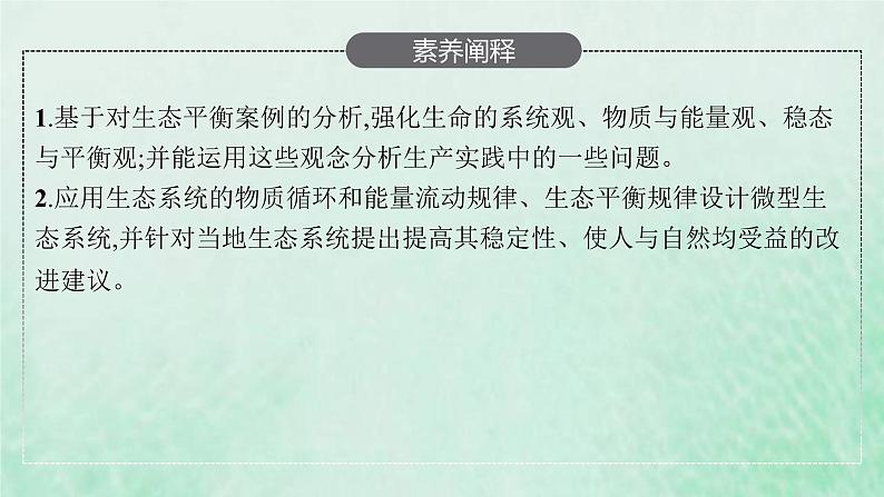 1.基于对生态平衡案例的分析,强化生命的系统观、物质与能量观、稳态与平衡观;并能运用这些观念分析生产实践中的一些问题。2.应用生态系统的物质循环和能量流动规律、生态平衡规律设计微型生态系统,并针对当地生态系统提出提高其稳定性、使人与自然均受益的改进建议。