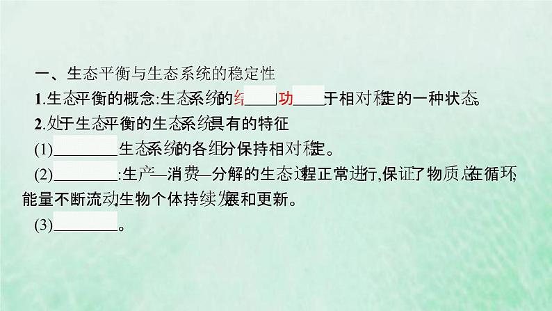 一、生态平衡与生态系统的稳定性1.生态平衡的概念:生态系统的结构和功能处于相对稳定的一种状态。2.处于生态平衡的生态系统具有的特征(1)结构平衡:生态系统的各组分保持相对稳定。(2)功能平衡:生产—消费—分解的生态过程正常进行,保证了物质总在循环,能量不断流动,生物个体持续发展和更新。(3)收支平衡。
