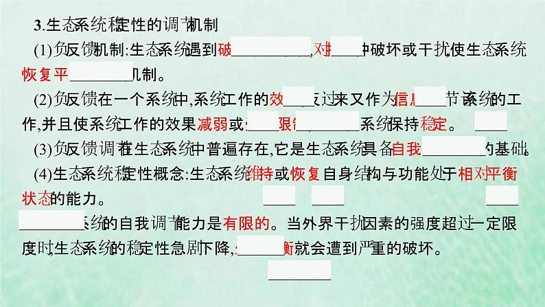 3.生态系统稳定性的调节机制(1)负反馈机制:生态系统遇到破坏或干扰后,对抗这种破坏或干扰,使生态系统恢复平衡的调节机制。(2)负反馈:在一个系统中,系统工作的效果,反过来又作为信息调节该系统的工作,并且使系统工作的效果减弱或受到限制,它可使系统保持稳定。(3)负反馈调节在生态系统中普遍存在,它是生态系统具备自我调节能力的基础。(4)生态系统稳定性概念:生态系统维持或恢复自身结构与功能处于相对平衡状态的能力。4.生态系统的自我调节能力是有限的。当外界干扰因素的强度超过一定限度时,生态系统的稳定性急剧下降,生态平衡就会遭到严重的破坏。