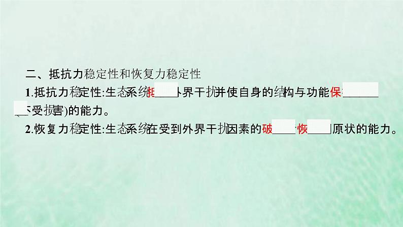 二、抵抗力稳定性和恢复力稳定性1.抵抗力稳定性:生态系统抵抗外界干扰并使自身的结构与功能保持原状(不受损害)的能力。2.恢复力稳定性:生态系统在受到外界干扰因素的破坏后恢复到原状的能力。