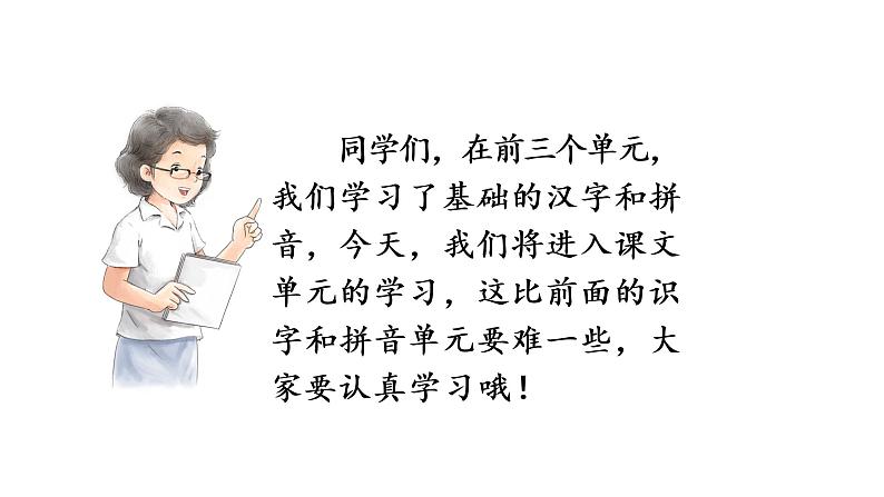 展开同学们,在前三个单元,我们学习了基础的汉字和拼音,今天,我们将进入课文单元的学习,这比前面的识字和拼音单元要难一些,大家要认真学习哦!