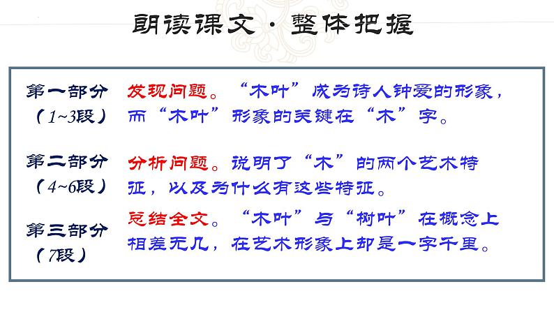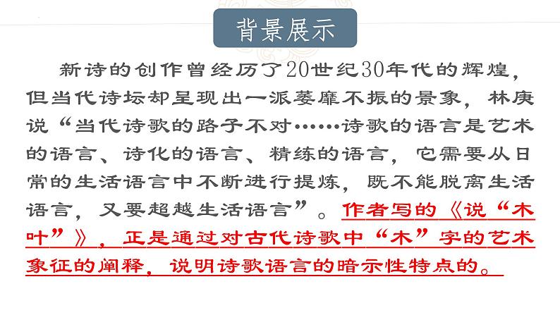 这是一份人教统编版必修 下册9 说“木叶”课堂教学课件ppt,共41页。PPT课件主要包含了知人论世,文本研讨,阅读文章理清思路,枝繁叶茂饱满等内容,欢迎下载使用。