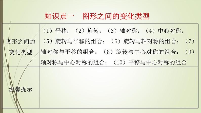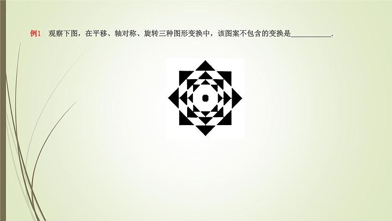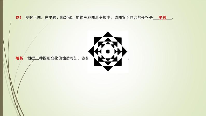 例1 观察下图,在平移、轴对称、旋转三种图形变换中,该图案不包含的变换是___平移___.解析 根据三种图形变化的性质可知,该图案不包含的变换是平移.