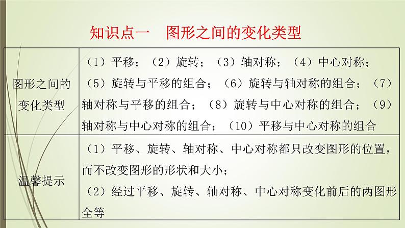 例1 观察下图,在平移、轴对称、旋转三种图形变换中,该图案不包含的变换是___平移___.解析 根据三种图形变化的性质可知,该图案不包含的变换是平移.点拨 正确区分平移、旋转和轴对称是解决此类问题的关键.