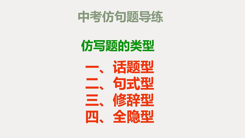 这是一份专题训练-仿写 课件,共18页。PPT课件主要包含了中考仿句题导练,仿什么,仿写题的类型,话题型,句式型,修辞型,全隐型,仿句练习等内容,欢迎下载使用。