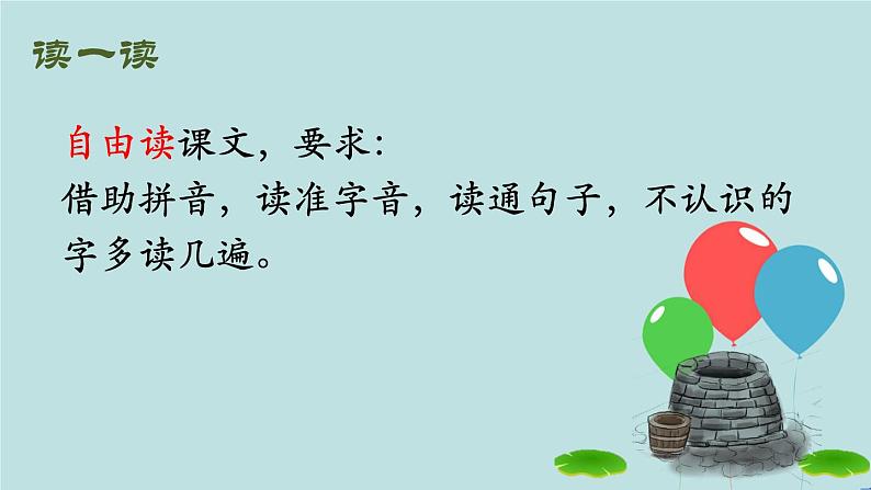 自由读课文,要求:借助拼音,读准字音,读通句子,不认识的字多读几遍。