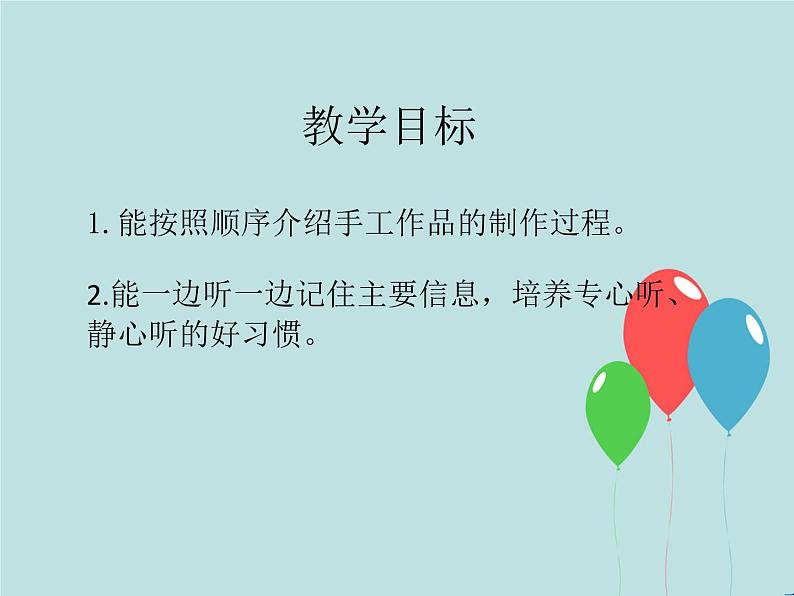 教学目标1.能按照顺序介绍手工作品的制作过程。2.能一边听一边记住主要信息,培养专心听、静心听的好习惯。