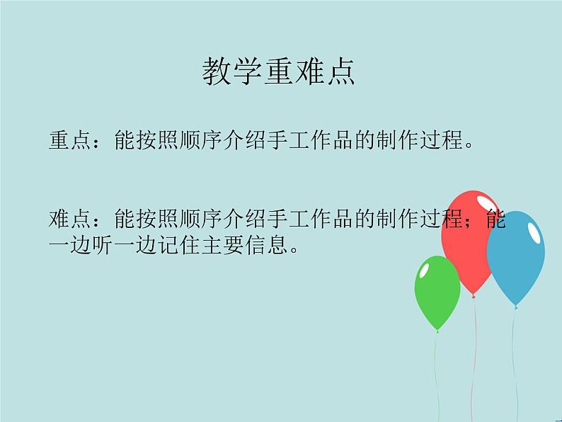 教学重难点重点:能按照顺序介绍手工作品的制作过程。难点:能按照顺序介绍手工作品的制作过程;能一边听一边记住主要信息。