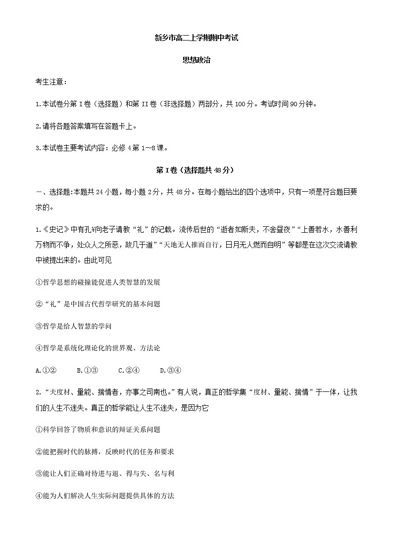 这是一份2022新乡高二上学期期末政治试题含解析,文件包含河南省新乡市2021-2022学年高二上学期期末考试政治试题含解析docx、河南省新乡市2021-2022学年高二上学期期末考试政治试题无答案docx等2份试卷配套教学资源,其中试卷共29页, 欢迎下载使用。