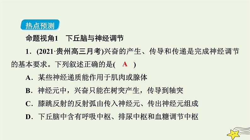 热点预测 命题视角1 下丘脑与神经调节1.(2021·贵州高三月考)兴奋的产生、传导和传递是完成神经调节的基本要求。下列叙述正确的是( )A.某些神经递质能作用于肌肉或腺体B.神经元中,兴奋只能在树突产生,传导到轴突C.膝跳反射的反射弧由传入神经元、传出神经元组成D.下丘脑中含有呼吸中枢、排尿中枢和血糖调节中枢